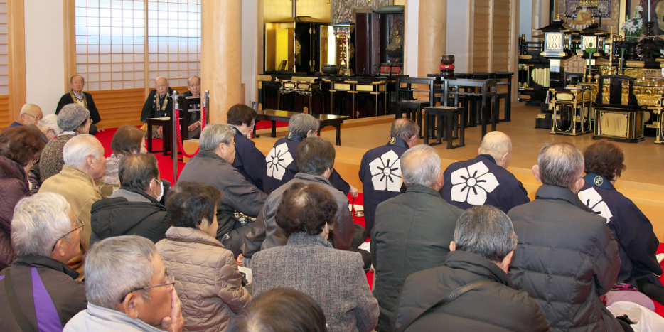 下の写真は節分法要(毎年2月3日)の様子です。お檀家様以外の方も大勢お越しになり、盛大に執り行っています。法要前には落語家さんによる無料公演もございますので、ぜひ一度ご参加ください。